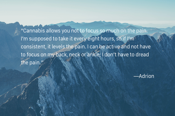 Cannabis has also greatly improved Anne’s mobility. “It helps me get up out of the bed,” she says. “Cannabis allows you not to focus so much on the pain. I’m supposed to take it every eight hours, so if I’m consistent with the tincture, it levels the pain. I can be active and not have to focus on my back, neck or ankle; I don’t have to dread the pain.”